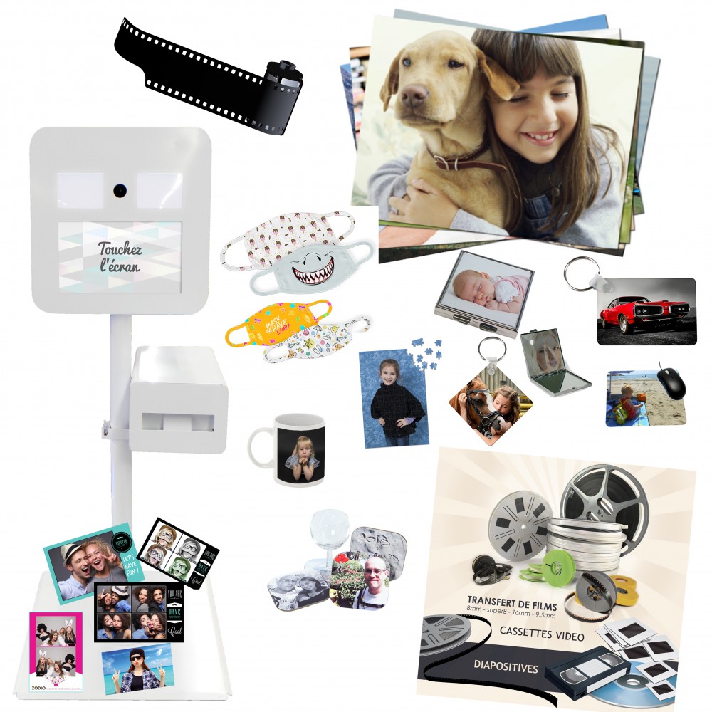 * UN LABO PHOTOS : - Développement de films - Tirage numérique - Reproduction de photos et de diapositives - Transfert de films sur DVD ( Cassettes vidéo - 8mm - Super8 - 16mm - 9,5mm ...) - Création d'objets personnalisés (mugs, masques, dessous de verre, puzzles, tapis de souris, planche à découper, peluches, ...) - Location de borne selfie
